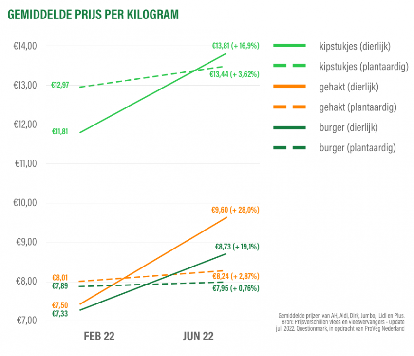 Opvallend: op vier maanden tijd is de prijs van vlees met gemiddeld 21% gestegen, maar die van vleesvervangers met slechts 2%. In februari waren vegetarische burgers, gehakt en kipstukjes februari in 44% van de gevallen goedkoper of ongeveer even duur; nu is dat zo in 66% van de gevallen. Hoewel de verschillen tussen supermarkten en tussen producten onderling groot blijven, is de trend algemeen.