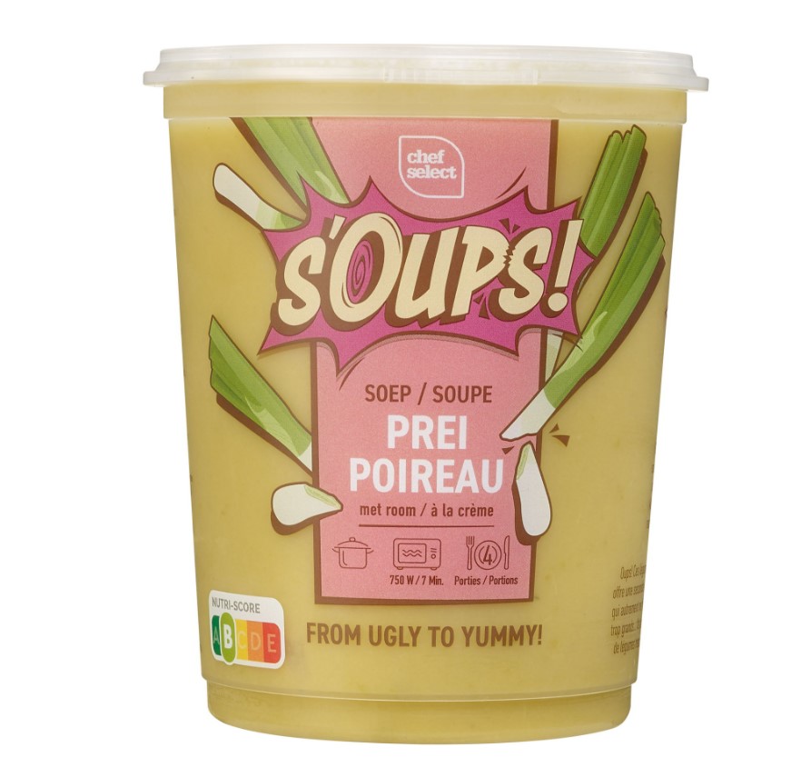 S’oups is verkrijgbaar in drie smaken: wortel, prei en tomaat. Een soepemmer van 950 ml kost 2,99 euro. Sinds de lancering anderhalve maand geleden heeft Lidl al bijna 38.000 liter verse soep verkocht en zo’n 3.000 kilo lelijke groenten gered.