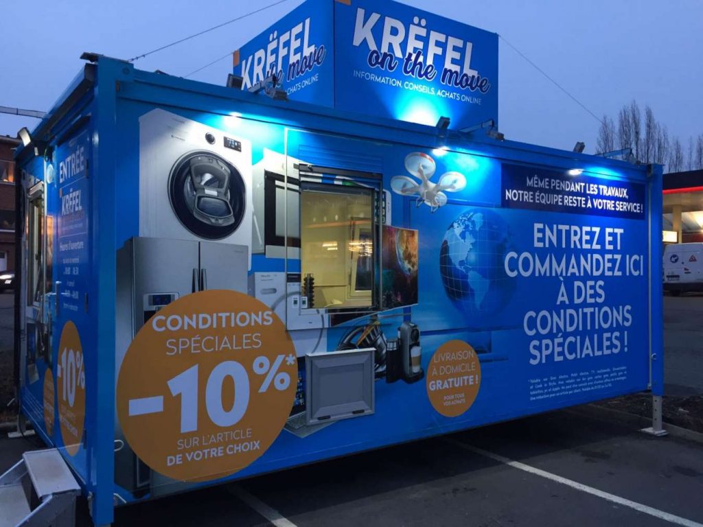 Le concept ‘Krëfel on the move’ est une primeur dans le secteur de l’électroménager et permettra d’assurer la continuité du service à la clientèle durant la période de fermeture du magasin. Toutefois les produits ne sont pas disponibles sur place, mais une équipe de vente conseille les clients et les aide à passer leur commande en ligne. Le pop-up dispose également de caisses et d’un service après-vente.