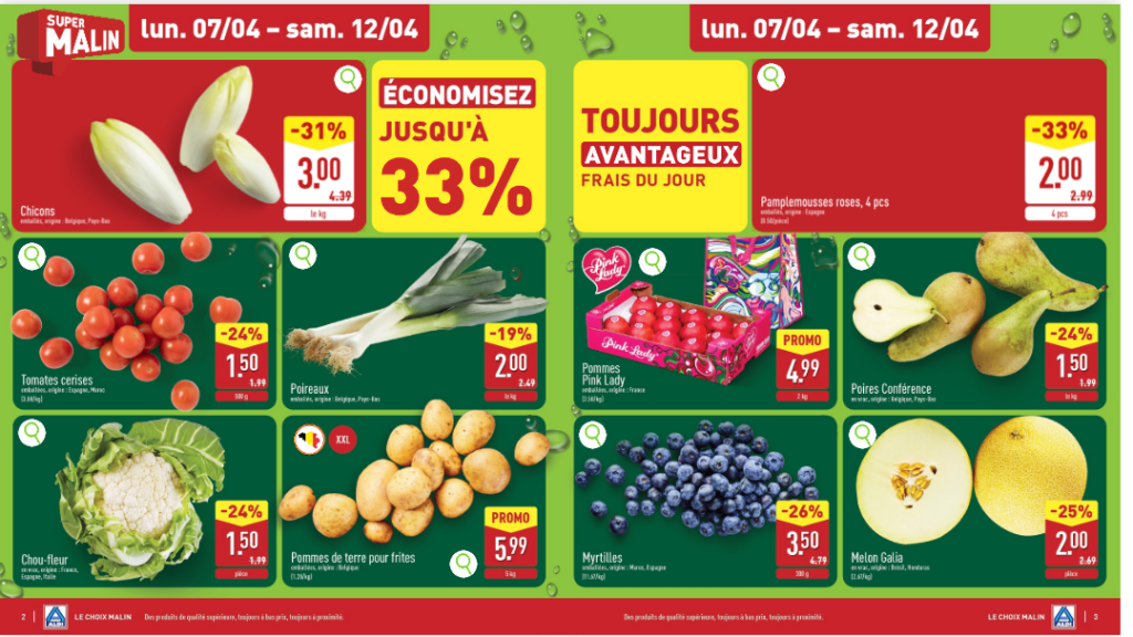 Plus loin dans le dépliant, les consommateurs trouveront des promotions thématiques, comme la foire aux vins et les offres non alimentaires du mercredi. Viennent ensuite les offres temporaires du vendredi, telles que toutes sortes de promotions 1+1, et les offres non alimentaires du samedi. Enfin, les week-ends super malins : quatre promotions supplémentaires sur les produits frais, valables uniquement le week-end.