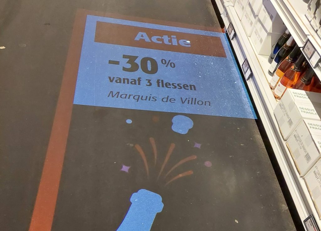 Dans le département du champagne, par exemple, Colruyt a projeté une promotion du folder, offrant aux clients une réduction de 30% pour l’achat de trois bouteilles de Marquis de Vilon. Sur la place devant les caisses, la projection rappelait aux clients d’installer l’application Xtra sur leur smartphone, en remplacement de la carte Xtra. Et la rayonne saisonnière présentait des images de Noël.