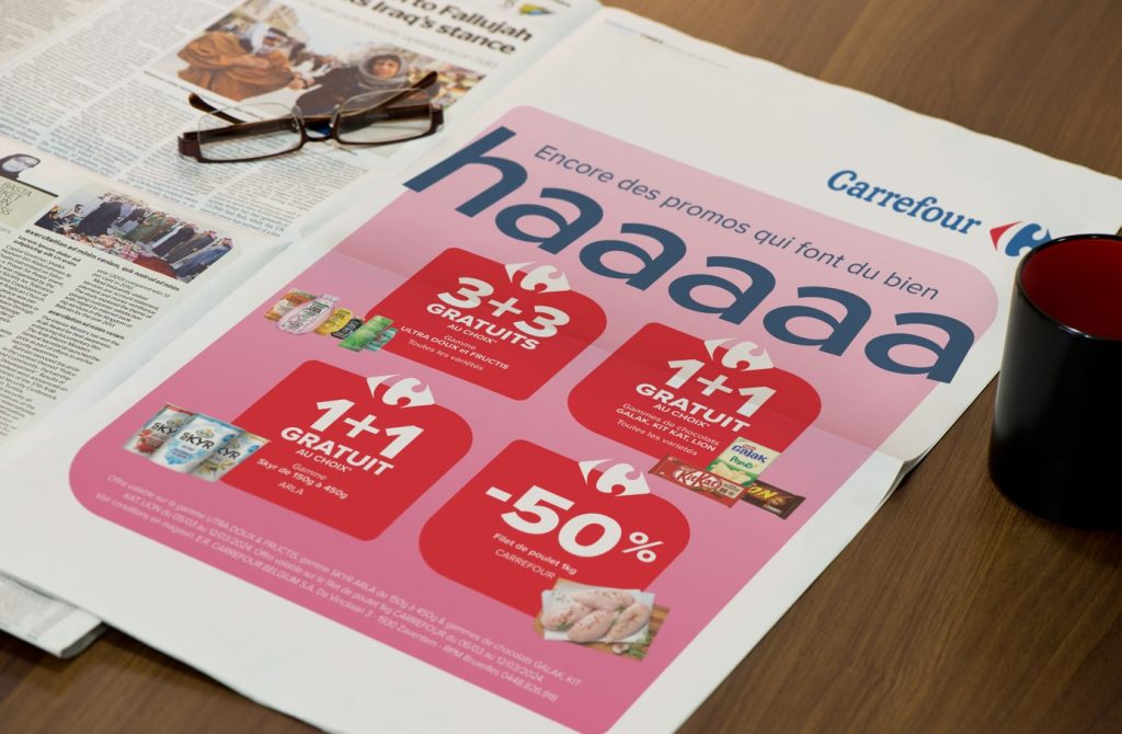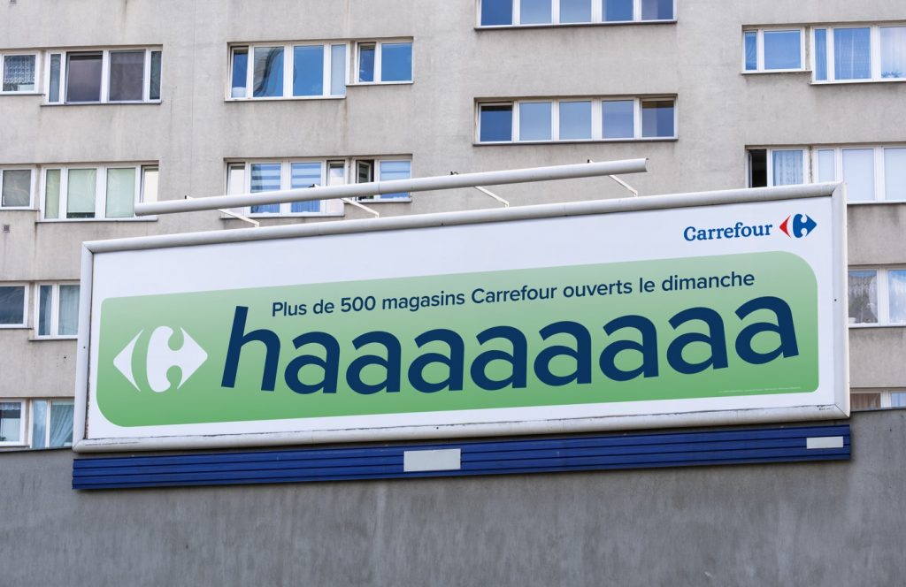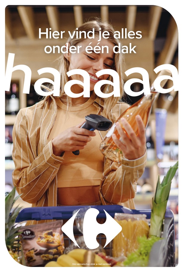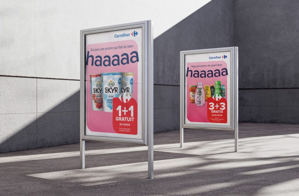 Il s’agit d’une campagne à 360°, comme on l’appelle en termes de marketing : elle passe à la télévision, à la radio (après tout, il faut entendre ce « haaaaa »), dans les cinémas, sur de grands panneaux d’affichage de 20 m² et des affiches de 2 m² sur les abribus, et bien sûr aussi en ligne, sur les médias sociaux, les plateformes vidéo, le site web de Carrefour, l’application… Le nouvel angle durera certainement un an ou deux, pense le directeur du marketing : c’est le temps qu’il faudra pour que l’homme de la rue associe le sentiment de « haaaaa » à Carrefour.