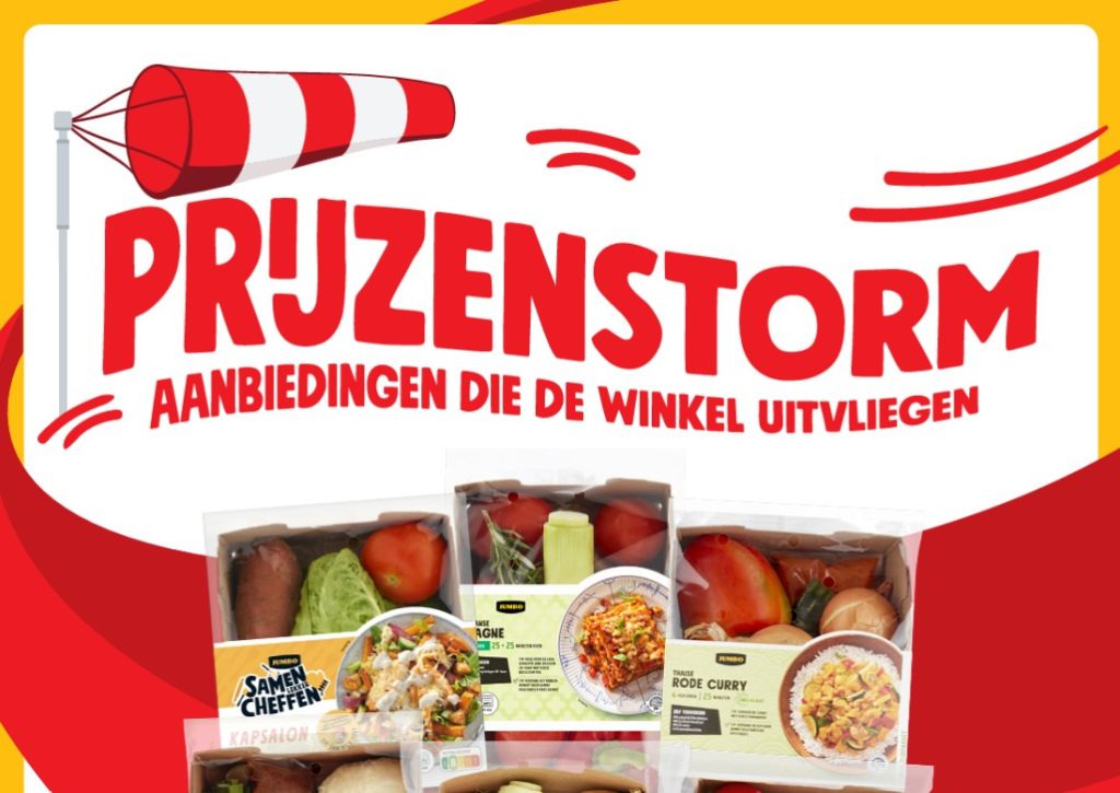 Jumbo renforce son image de marque en matière de prix grâce à des offres promotionnelles : tant aux Pays-Bas qu’en Belgique, les prospectus de ce mois-ci sont placés sous le signe de la « tempête des prix » lancée pour la première fois l’année dernière.
