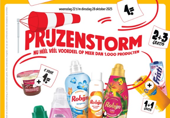 Le prospectus hebdomadaire ne laisse guère de doute à ce sujet, avec en première page le titre « Tempête de prix – maintenant de très nombreuses réductions sur plus de 1 000 produits ». Le prospectus propose de nombreuses promotions « gratuites » sur des marques connues, allant de 1+1 à 2+3, et de nombreux produits pour seulement un euro. Sur son site web et ses réseaux sociaux, Jumbo annonce également une tempête de prix, « avec des offres qui vous épateront », dans une vidéo mettant en scène l’acteur Frank Lammers.