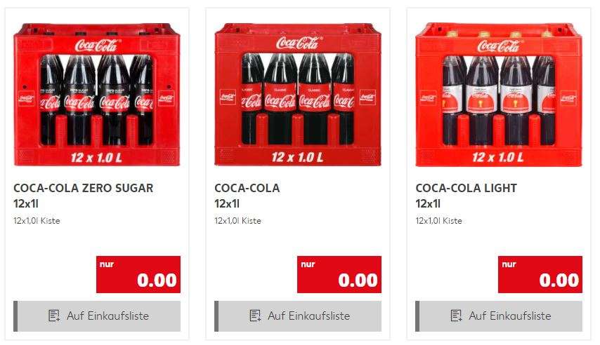 Aujourd’hui, les clients du webshop de la chaîne allemande d’hypermarchés Kaufland peuvent profiter d’une offre inédite : certains produits Coca-Cola sont vendus au prix de 0,00 euro tout rond.
