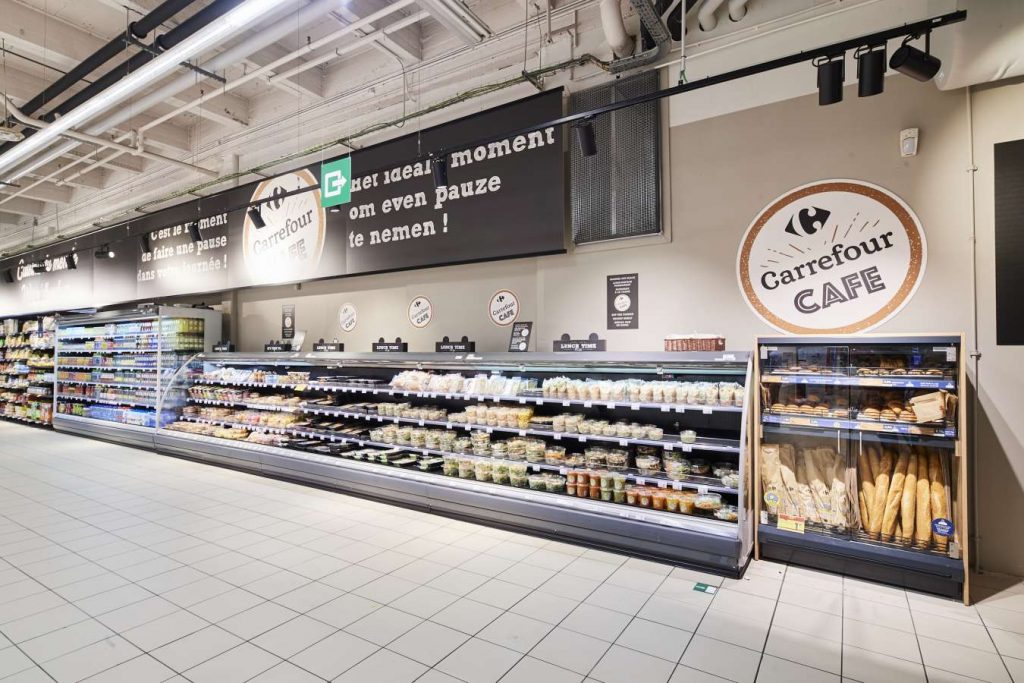 L’hypermarché voit grand avec le nouveau Carrefour Café. À toute heure de la journée, les consommateurs y trouvent des repas qu’ils peuvent manger sur place. Il y a un choix entre des repas préparés sur place (sandwichs, salades, potages, sushis, woks) et des produits de la gamme Carrefour Lunch Time. En attendant, les clients ont la possibilité de recharger leur téléphone et d’utiliser le wifi gratuit.