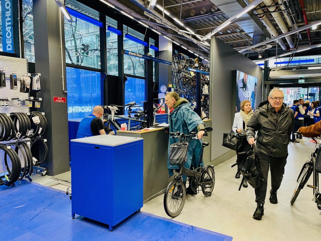 L’atelier à l’entrée donne tout de suite le ton : Decathlon donne aussi plus de place aux services ailleurs, avec de l’occasion mais aussi de la réparation, de la location, un comptoir pour récupérer les commandes, des casiers qui restent accessibles 24 heures sur 24 et 7 jours sur 7…