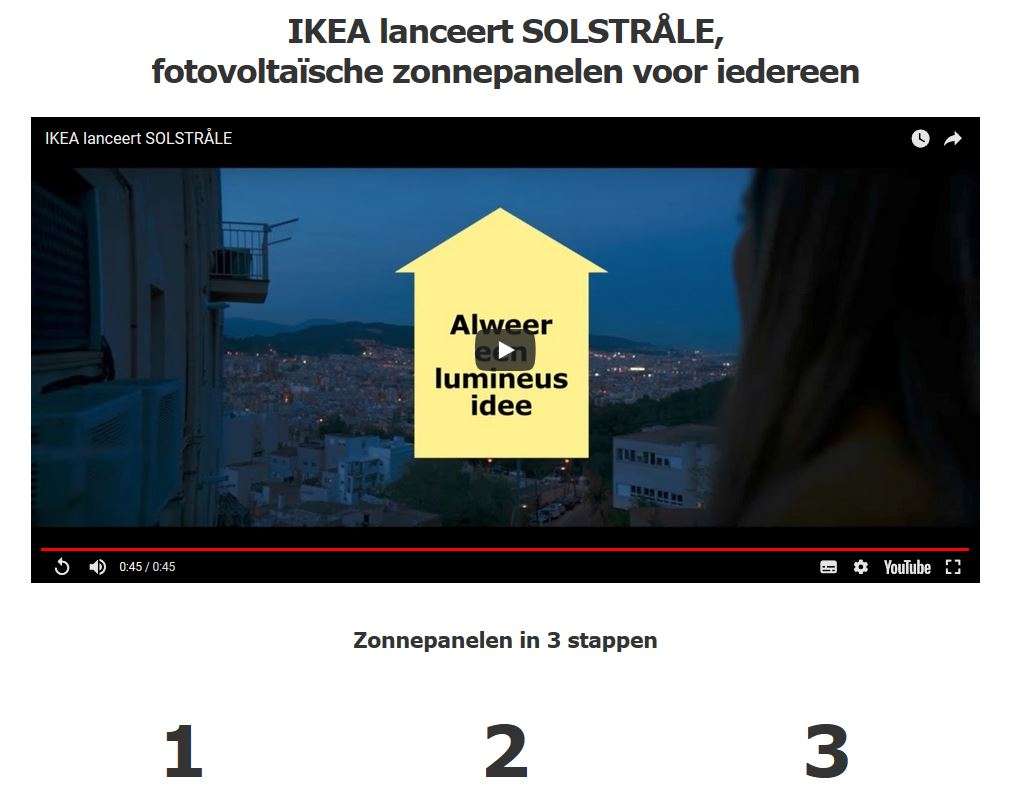 « Encore une idée lumineuse », tel est le slogan de la vidéo de lancement, après quoi Ikea explique comment en trois étapes simples faire installer des panneaux solaires sur son toit. « L’achat de panneaux solaires reste une affaire compliquée et nous voulons que cela change », explique Catherine Bendayan, CEO d’Ikea Belgique, dans le journal De Tijd.