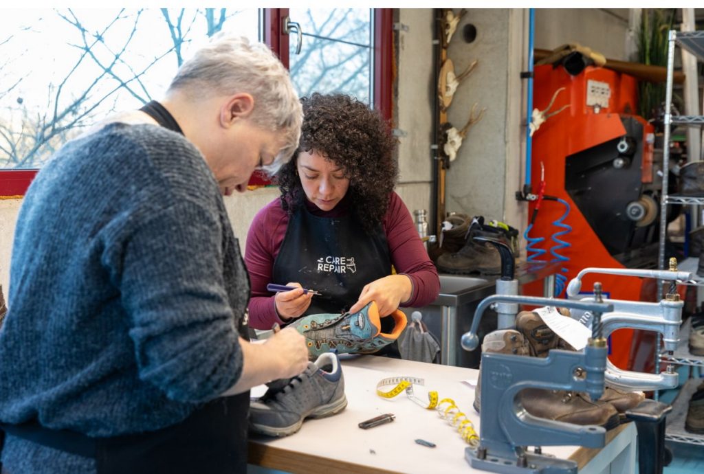 Dans un tout nouvel atelier de réparation et d’entretien, A.S. Adventure rassemble toutes ses initiatives circulaires. Ici, le détaillant prolonge la durée de vie des chaussures, des vêtements et des équipements sportifs : « Achetez moins, mais mieux ».