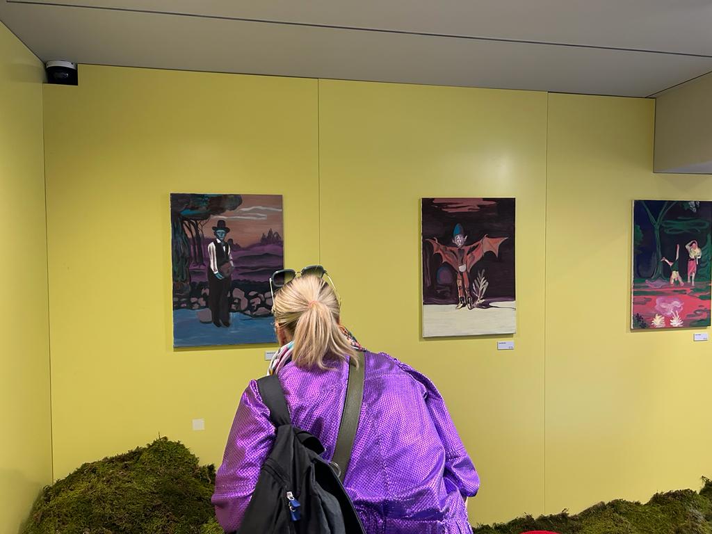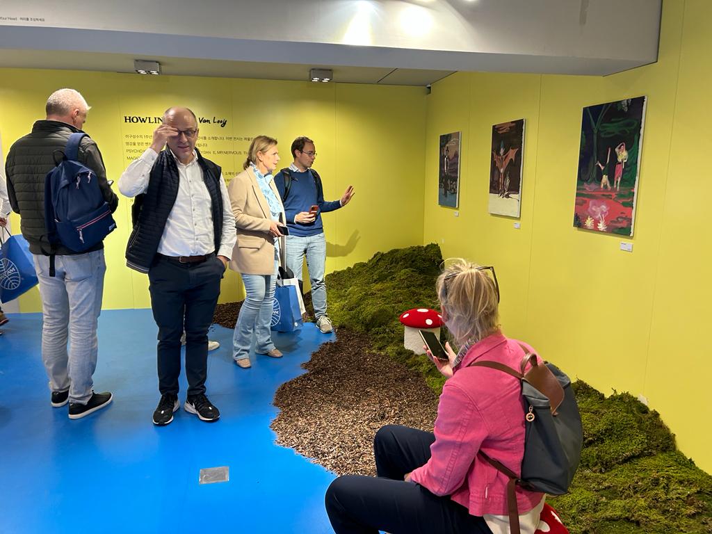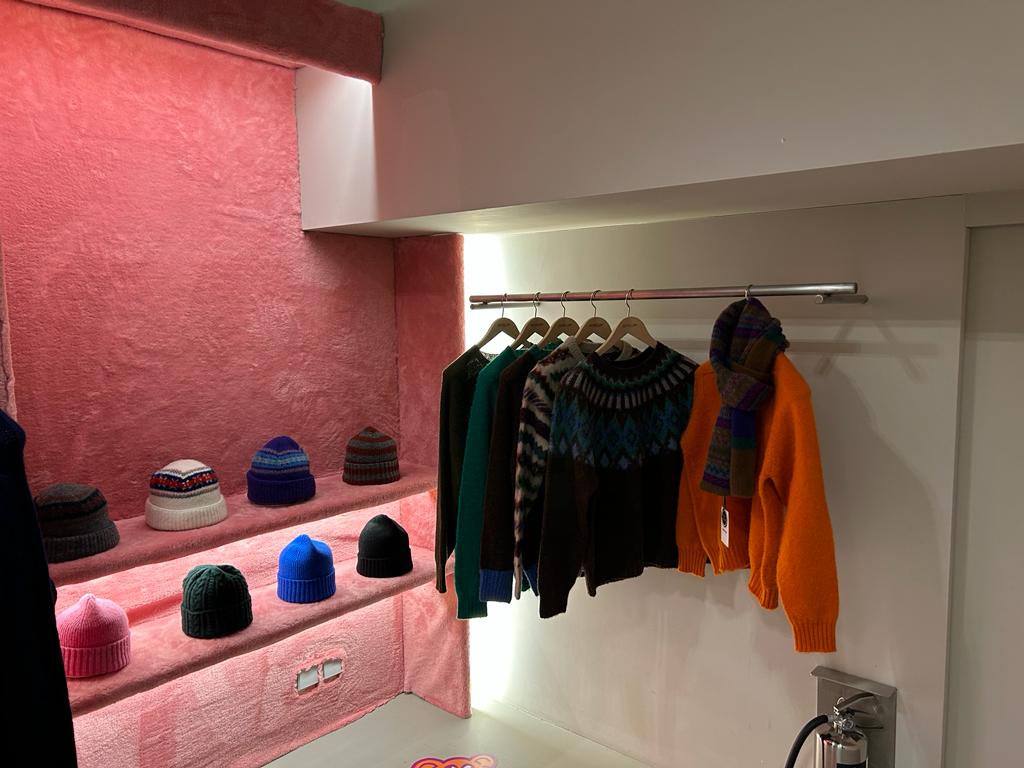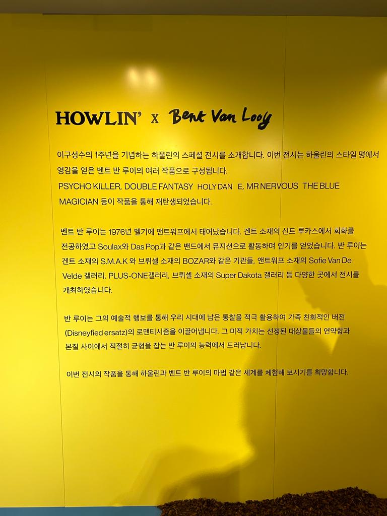 À l’étage, une exposition présente des œuvres d’art créées pour la marque par le chanteur et artiste Bent Van Looy. Ces œuvres s’inspirent de différents styles de tricot de Howlin’, tels que Psycho Killer, Mr Nervous et The Blue Magician. Les visiteurs y découvriront également le conte « To Holy Dance and Back Again ». L’exposition sera présentée en Belgique dès décembre.