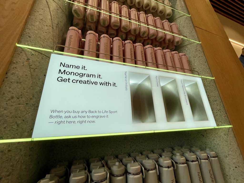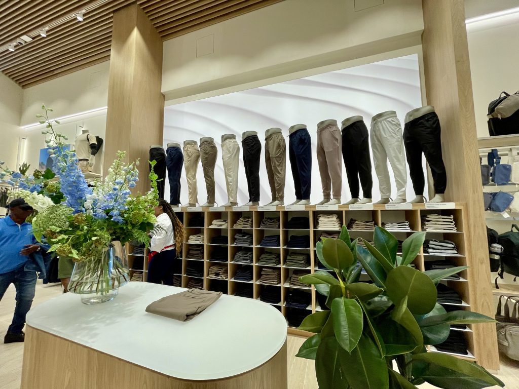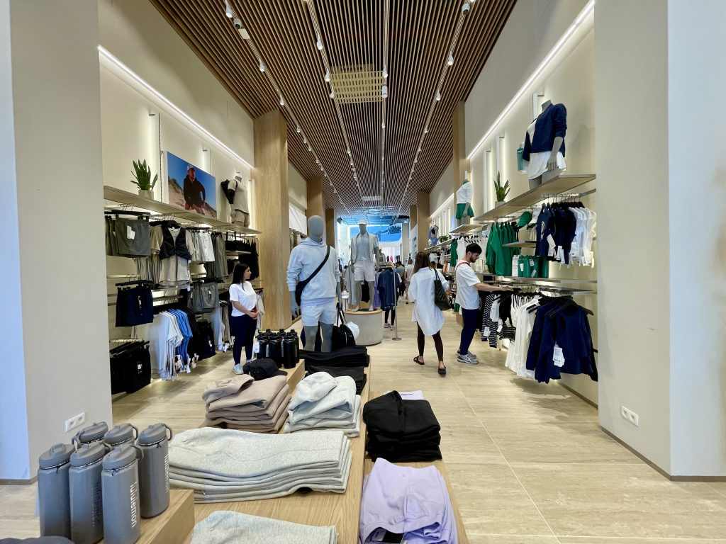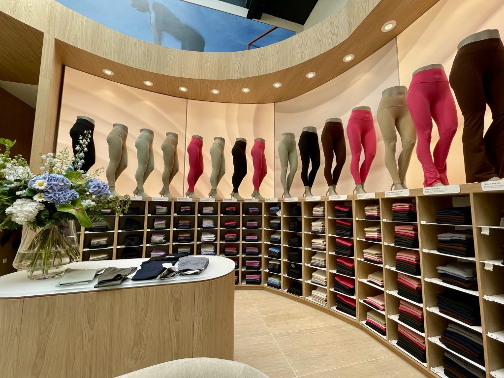 Les clients trouveront toute la gamme de vêtements pour le yoga, la course à pied, l’entraînement, le tennis, le golf et l’exercice physique quotidien. Les vêtements pour femmes sont suspendus à droite, ceux pour hommes à gauche, et les neuf cabines d’essayage sont unisexes. Il existe également des accessoires, tels que des sacs ou des bouteilles de boisson, que vous pouvez faire graver sur place pour une touche personnelle.