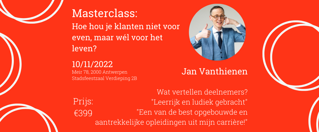 Tip 2: Schrijf je nu ook in voor de Masterclass ‘Hoe 3 keer meer verkopen met minder inspanningen én zonder extra uitgaven?’van woensdag 5 oktober. In deze topsessie leert omzetverdubbelaar Jan Vanthienen hoe in verkoopgesprekken veel sneller, makkelijker en vaker direct een ‘Ja’ krijgt. Je krijgt heel eenvoudige en praktisch snel omzetbare tips om in verkoopgesprekken véél minder zelf te praten, minder te improviseren of uit te wijken en veel meer de leiding te houden. Je leert geen methode voor het voeren van traditionele verkoopgesprekken, maar wel voor het voeren van persoonlijke verkoopgesprekken. Aan het eind daarvan is de sale voor je klant vanzelfsprekend.