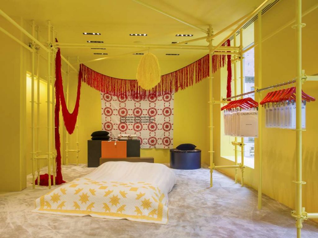 H.F.: “Eentje die me laatst opviel is de flagshipstore van Calvin Klein in New York. Die hebben ze van muur tot plafond in het kanariegeel geverfd. Een radicale keuze die de kracht van kleur aantoont: met een nieuwe kleur en enkele kleine ingrepen werd de minimalistische tempel van voorheen getransformeerd tot een eclectische, levendige en coole ruimte die jongere mensen moet aanspreken. Die kleur is echt strategisch gekozen, daarom vind ik het zo goed.