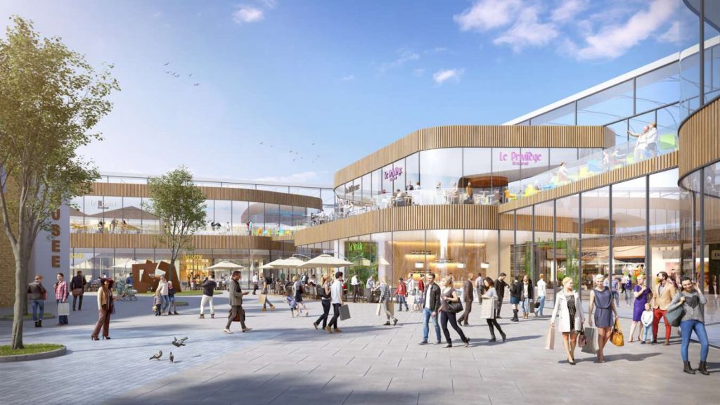Zo is de totale oppervlakte teruggebracht van 38.500 naar slechts 28.000 m². Het is vooral het winkelcentrum dat deel uitmaakt van Strada dat aan oppervlakte moet inboeten: er komt nu een winkelcentrum van twee verdiepingen, met ongeveer 1.100 parkeerplaatsen. Die keuze werd gemaakt nadat de commerciële kernen van onder andere Bergen en Charleroi fors werden opgewaardeerd, waardoor er teveel concurrentie is voor een groot winkelcentrum.