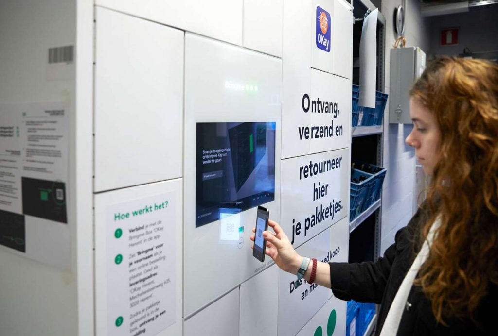 Een half jaar lang kunnen klanten van OKay Herent (foto), OKay Vossem, OKay Welle, OKay Compact Elsene, OKay Compact Boudewijnstraat Antwerpen en Bio-Planet Leuven de Bringme-service uittesten. Die valt nog het best te omschrijven als een kruising tussen een intelligente brievenbus en een kast met verschillende lockers. Het bedrijf achter de ‘intelligente leveringsboxen’ begon in 2012 met een slimme ’thuisleveringskast’, maar breidde zijn service al snel uit met grotere exemplaren met verschillende afgesloten boxen en een touchscreen, ideaal voor kantoren en winkels.