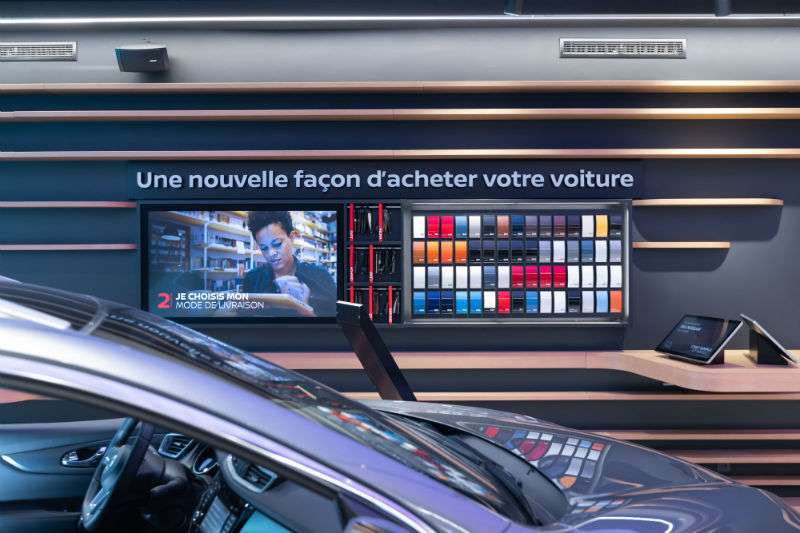 Nissan heeft een nieuw verkoopconcept onthuld in Parijs: in het winkelcentrum Vélizy 2 heeft de autofabrikant een hybride showroom geopend, die sterk inspeelt op e-commerce en digitale technologie. Klanten kunnen er weliswaar een auto oppikken voor een testrit en geholpen worden door medewerkers van vlees en bloed, maar de eigenlijke aankoop gebeurt online.