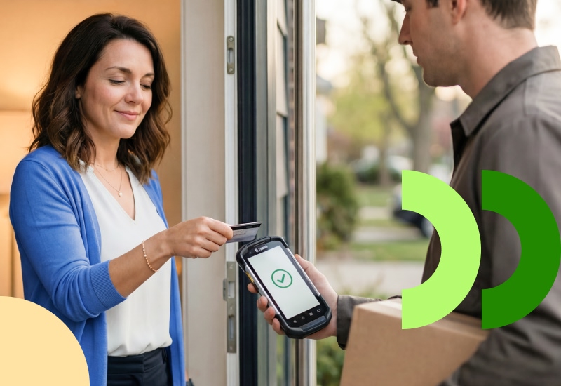 Later die dag ontvangt Emma een pakket aan huis. De betaling gebeurt bij aflevering, via de Android-handheld van de bezorger met CCV SoftPOS.