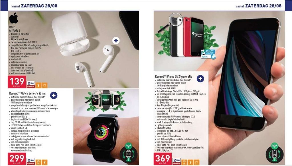 In de folder van de retailer (foto) staat duidelijk aangegeven dat het niet om nieuwe toestellen gaat: dat was een punt van kritiek dat Test Aankoop uitte op het nieuws. Ook in de winkels komt er een extra pancarte om de klanten goed te informeren. Aldi verzekert dat de toestellen op 80 punten getest werden en dat ze uitsluitend originele onderdelen bevatten.