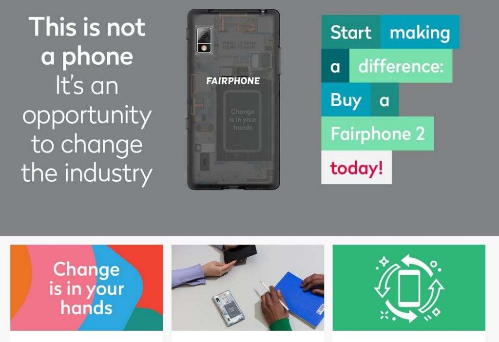 Fairphone startte in 2009 als bewustwordingscampagne voor meer ethiek in de productie van smartphones en bracht in 2013 zijn eerste eigen model op de markt, zonder metalen uit conflictgebieden (als tantalium en tin) en gemaakt onder faire arbeidsomstandigheden. In 2015 volgde een tweede model, dat modulair was: het bestaat uit losse onderdelen die bij defect of een upgrade vrij makkelijk te vervangen zijn, iets wat bij traditionele smartphones nogal problematisch is.