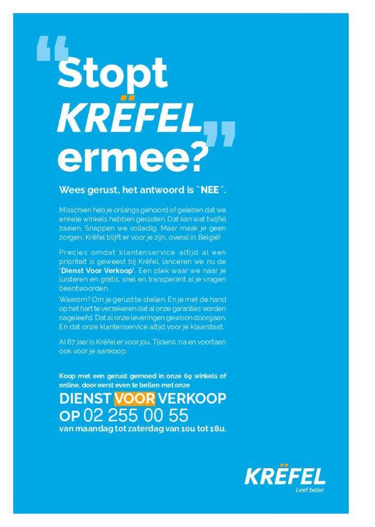 “Stopt Krëfel ermee?”: dat is de kop in paginagrote advertenties in de kranten van het afgelopen weekend en in een mailing naar de klanten. “Wees gerust, het antwoord is NEE”, zo luidt het vervolg. De retailer reageert hiermee op de berichtgeving van de afgelopen weken en maanden: niet alleen besliste het bedrijf begin dit jaar om vier winkels te sluiten, ook verschenen er artikels over rode cijfers en over het aantreden van een nieuwe CEO, Vincent Nolf, die elektroketen uit het slop moet halen.