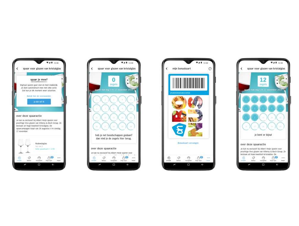 De eerste spaaractie met de digitale zegeltjes is er één voor glazen van Villeroy & Boch uit kristalglas, die tot november loopt. In 2014 voerde de supermarktketen in Nederland al eens eenzelfde actie: toen verzamelden meer dan een miljoen huishoudens bijna 4,5 miljoen glazen.