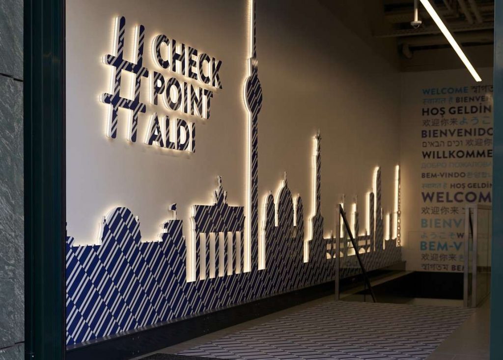 De unieke winkel in de Berlijnse Friedrichstraße is genoemd naar Checkpoint Charlie, de voormalige grensovergang tussen Oost- en West-Berlijn, op slechts een paar minuten lopen. Aldi trekt hier alle registers open om zijn merkidentiteit ten volle uit te spelen. Dat begint met een blauwwit tapijt aan de inkom, een muur met de verlichte Berlijnse skyline in het bekende blauwwitte patroon van de Aldi-tassen, en nog meer blauwwitte accenten in het winkelinterieur.