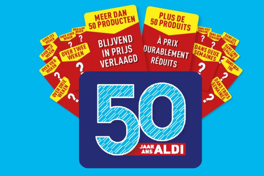 In België viert Aldi dit jaar zijn vijftigste verjaardag. De retailer trapt het feestjaar af met blijvende prijsverlagingen voor meer dan vijftig producten.
