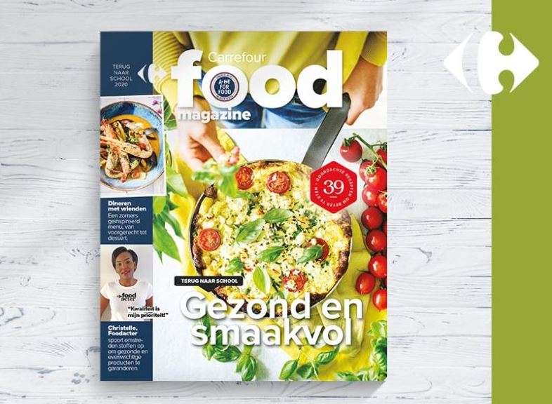 Deze week lanceert Carrefour de eerste editie van haar nieuwe klantenmagazine: Carrefour Food Magazine verschijnt voortaan tien keer per jaar en zal telkens uit 68 pagina’s bestaan, die steeds minstens dertig nieuwe recepten tellen. De recepten moeten “inspelen op alle consumententrends, zoals flexitarisme of vegetarisme, maar ook respectvol zijn voor het milieu, met name door de strijd tegen voedselverspilling”, laat de supermarktketen weten.