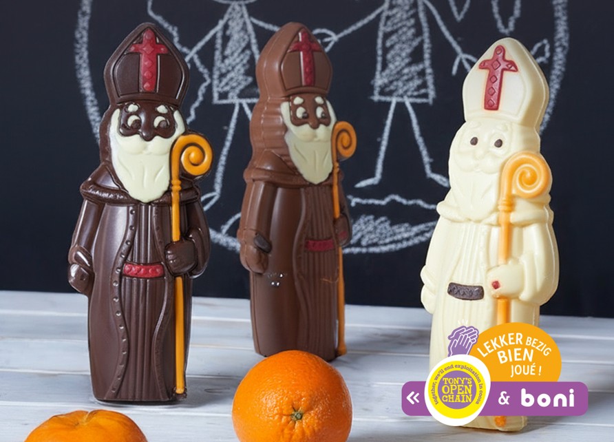 Drie nieuwe sintfiguren zijn nu verkrijgbaar bij Colruyt, Spar, Okay en Comarkt/Comarché. De verpakkingen zijn voorzien van het Lekker Bezig-, Tony’s Open Chain- en fairtrade-label. In 2026 en 2027 zullen alle chocoladetabletten en seizoensgebonden producten van het huismerk Boni voldoen aan deze standaarden. Het initiatief is een aanvulling op het Boni Living Income-project dat de retailer in 2020 in Ivoorkust lanceerde: sindsdien dragen alle standaard Boni Selection chocoladetabletten van 100 en 200 gram bij aan een leefbaar inkomen voor de cacaoboer.