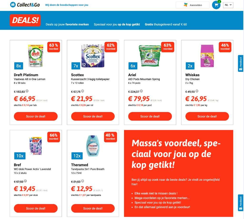 Op Deals! vinden klanten wekelijks nieuwe promo’s op grote volumes van dierenvoeding, verzorgings- en onderhoudsproducten, wasmiddel, papierwaren en babyartikelen. “Een voorbeeld is onze aanbieding op kwalitatieve Dreft Platinum vaatwastabletten: de klant koopt 8 pakken van 56 tabletten en betaalt 66,95 euro voor dat volume in plaats van 182,83 euro,” geeft Deprater aan. “Dat is een serieus voordeel van 63 procent en slechts 14 cent per vaatwastablet.” Het gaat steeds om A-merken, maar dan bijvoorbeeld met een ander parfum of een andere verpakking dan wat men in de fysieke winkel of de webshop van Colruyt vindt. Bovendien geldt “op is op”: wie de deal niet wil missen, wacht best niet tot de laatste dag om te bestellen.