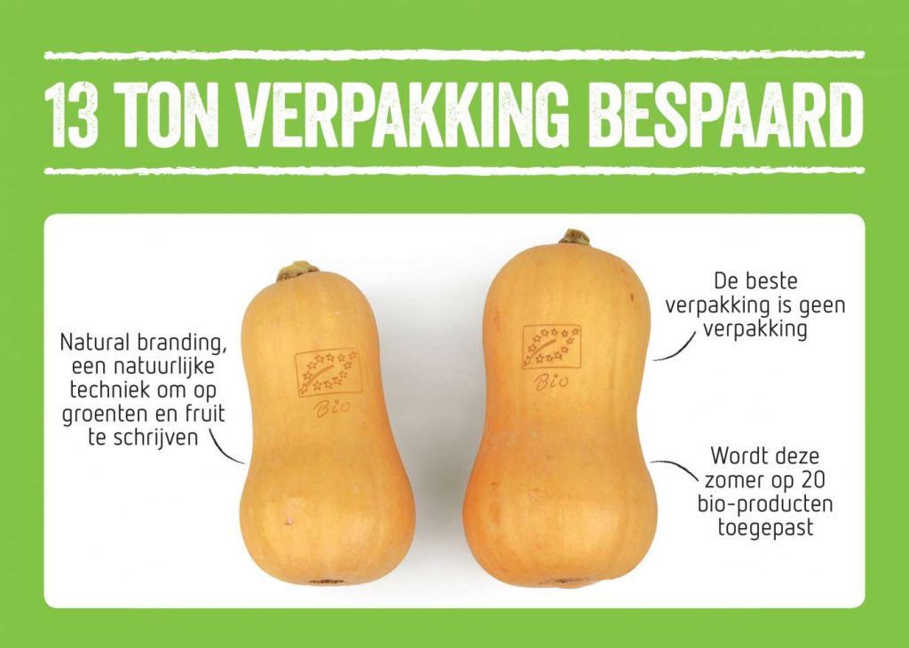 Delhaize gaat een groot deel van het bio-assortiment groenten en fruit voorzien van ‘natural branding’, waarbij de bio-aanduiding rechtstreeks op het product geplaatst wordt. Zo spaart de keten heel wat verpakkingen uit.