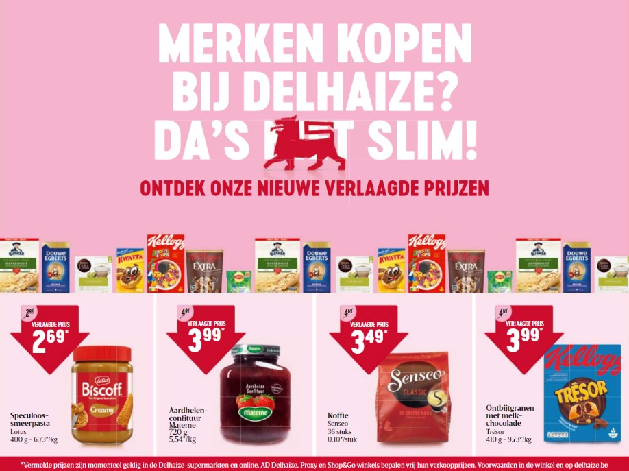 Sinds vorige week donderdag adverteert Delhaize in de pers en op zijn website enkele opvallende prijsverlagingen voor bekende A-merkreferenties. Het gaat om slechts elf producten, maar de prijsverlagingen zijn wel fors te noemen. Zo gaat de Biscoff speculoospasta 400g van 2,89 naar 2,69 euro, de Materne aardbeienconfituur 720g van 4,49 naar 3,99 euro, Senseo Classic 36 pads van 4,69 naar 3,49 euro en Kellogg’s Trésor melkchocolade 410g van 4,69 naar 3,99 euro.