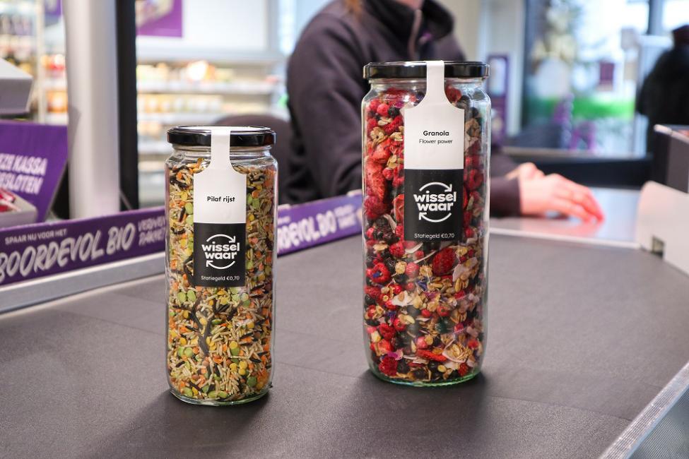 Binnenkort zijn in verschillende winkels van Ekoplaza Wisselwaar-potten te vinden. Het gaat om glazen potten gevuld met droge bulkproducten, zoals bonen, rijst, ontbijtgranen en conserven, maar ook flessen met zuivel. Klanten kunnen de glazen verpakkingen na gebruik inleveren en krijgen er statiegeld voor terug. Op iedere pot zit 0,70 euro statiegeld, deelt de Nederlandse biogroep mee.