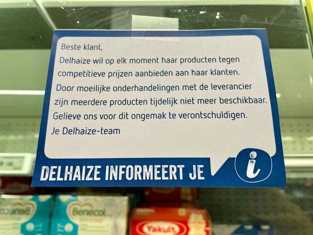 Wie het zuivelrayon bij Delhaize bezoekt, treft geen producten van Danone in de koelmeubels aan. Wel hangen er kaartjes met de volgende mededeling: “Beste klant, Delhaize wil op elk moment haar producten tegen competitieve prijzen aanbieden aan haar klanten. Door moeilijke onderhandelingen met de leverancier zijn meerdere producten tijdelijk niet meer beschikbaar. Gelieve ons voor dit ongemak te verontschuldigen.”