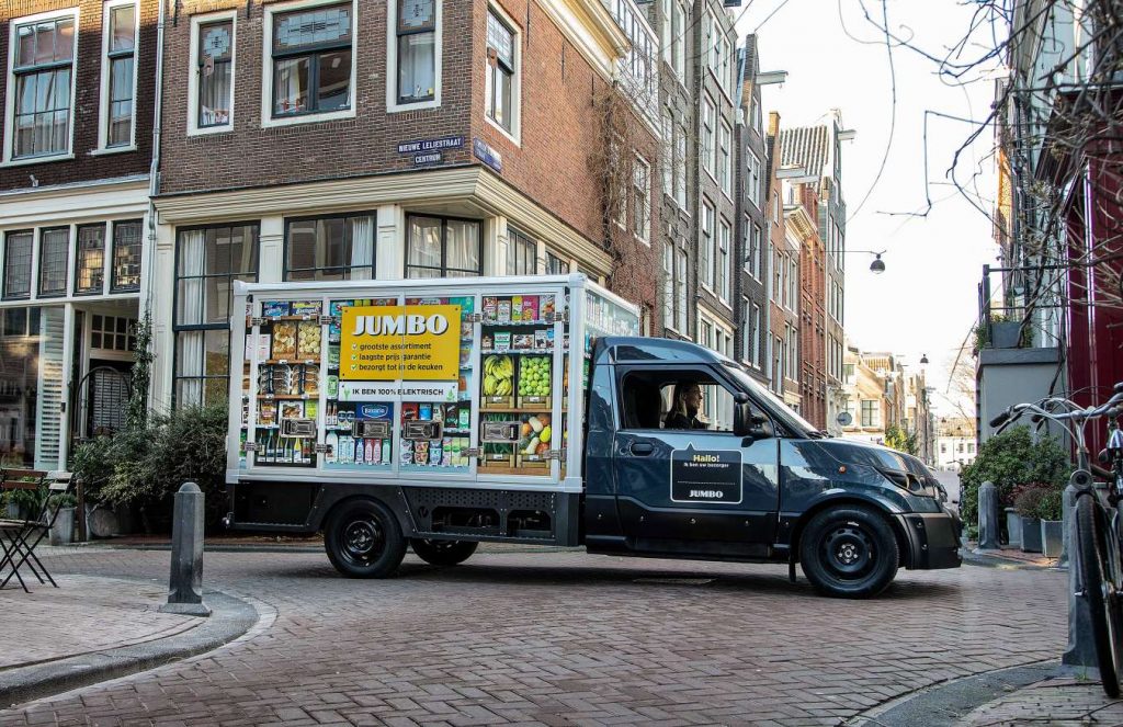 Jumbo levert voortaan ook aan huis in het centrum van Amsterdam: elektrische wagens van de supermarktketen brengen de boodschappen vanuit één centraal distributiepunt, waardoor ook meer bezorgmomenten mogelijk zijn.