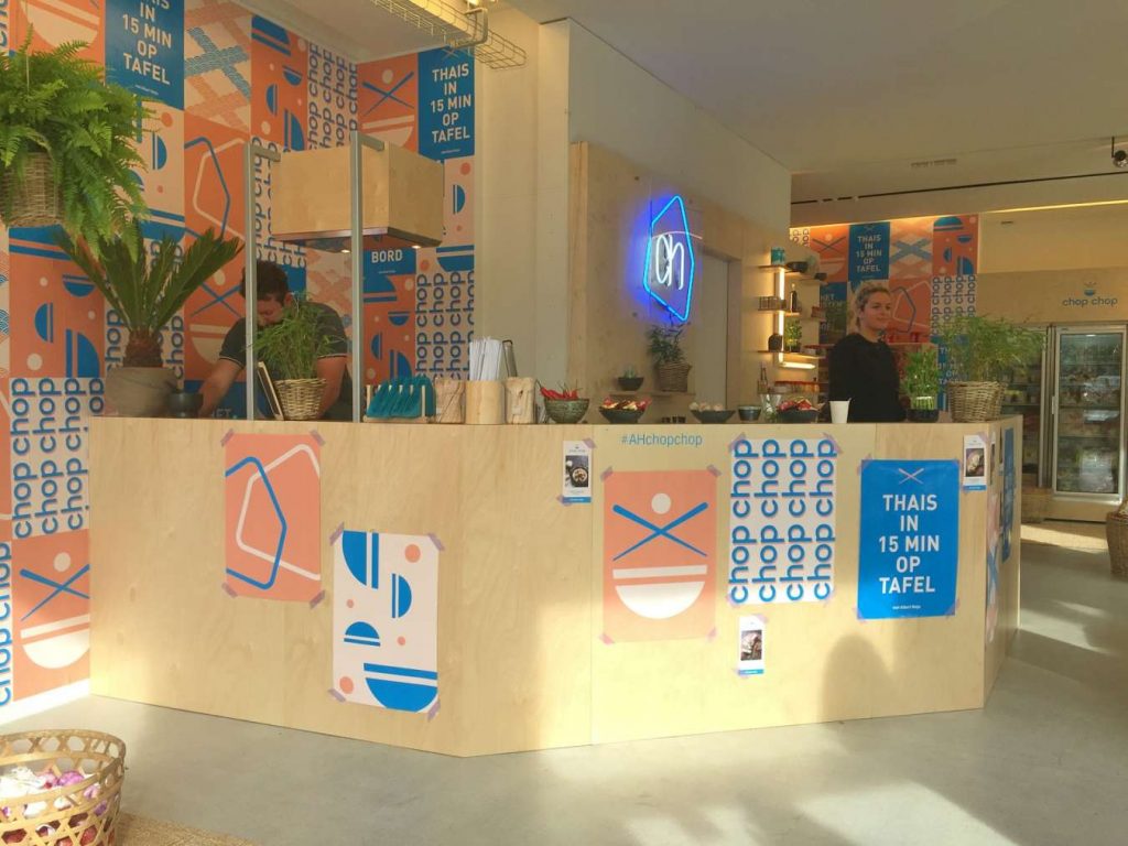“Thais in 15 minuten op tafel”, en “Het Oosten in 1, 2, 3 op je bord”: dat zijn de beloftes die Albert Heijn maakt in zijn nieuwste pop-upproject. Chop Chop is een winkel, geen horecagelegenheid. Wel is er een keukentje voorzien waar een kok proevertjes bereidt. De pop-up laat consumenten op deze manier kennismaken met eenvoudige Aziatische recepten zoals spring rolls, curries of noedelsalade. Daarbij ligt de nadruk op gemak: klanten vinden er meteen alle ingrediënten om de gerechten thuis snel te bereiden.
