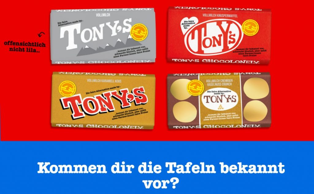 In het kader van een campagne met de slagzin “Tony’s Fair Alternative” had het chocoladebedrijf in Duitsland vier tijdelijke, parodiërende verpakkingen op de markt gebracht, geïnspireerd op het design van bekende chocoladerepen van Nestlé, Mars, Ferrero en Milka. Het doel van de campagne was om meer bewustzijn te creëren voor het feit dat de cacao-industrie nog steeds illegale kinderarbeid en moderne slavernij gebruikt.