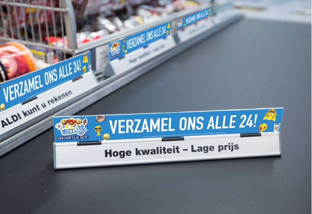 Van 16 september tot en met 26 oktober kunnen klanten zes weken lang emoji’s verzamelen bij Aldi. Per aankoopschijf van 15 euro ontvang je één fysieke emoji – een poppetje met zuignap. In totaal kan je er 24 verschillende verzamelen. Je kan ze bijhouden in een fysiek album, te koop voor 1,99 euro. In dat album zitten ook twee gezelschapsspelletjes.