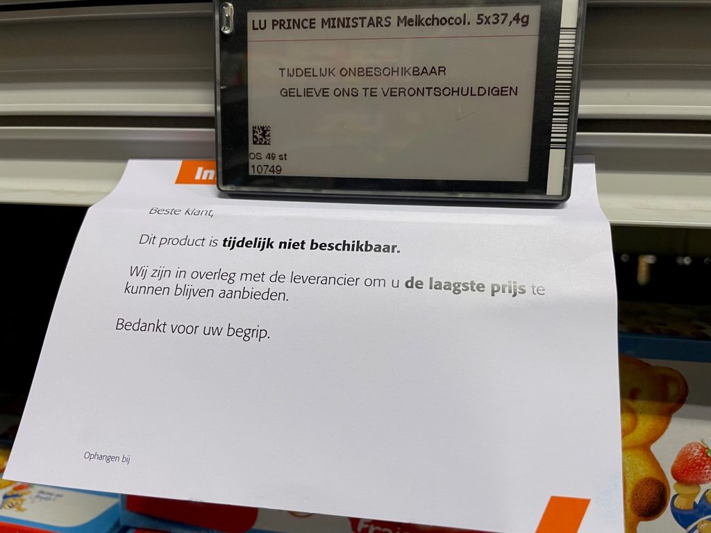 Enkele populaire koekjes van onder andere Prince, Pim’s, Petit Beurre of Cent Wafers vinden shoppers momenteel niet in de winkelrekken bij Colruyt. In de Collect&Go webshop lijken enkele chocoladeproducten van Côte d’Or – eveneens van fabrikant Mondelez – getroffen door de actie. Bij de lege schappen hangt een korte mededeling: “Dit product is tijdelijk niet beschikbaar. Wij zijn in overleg met de leverancier om u de laagste prijs te kunnen blijven aanbieden. Bedankt voor uw begrip.” Met die expliciete mededeling wil Colruyt z’n klanten wellicht duidelijk maken dat het inspanningen doet om de hoge voedselprijzen weer te doen dalen.