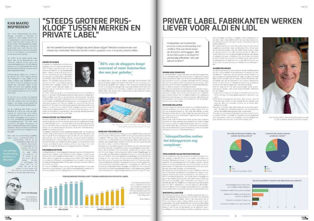Koen de Jong van IPLC vertelt in datzelfde nummer waarom huismerkfabrikanten liever voor Aldi en Lidl werken dan voor de grote supermarktketens, en Tom Penninckx van Nielsen waarschuwt de merkfabrikanten voor een al te grote prijskloof met de huismerken. Walter Gelens van BABM geeft tegengas en voert aan dat iedereen wint met A-merken in de winkel.