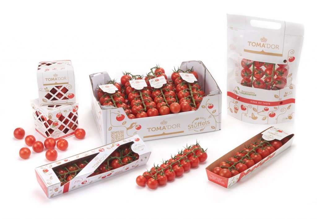 Met een grote verscheidenheid aan verpakkingsmogelijkheden vindt het merk zijn weg naar menig winkelschap. Met de 3kg of 1,5kg doos creëer je het luxe marktgevoel met de schitterende lange trospresentatie van de Toma’dor. Kleinverpakkingen voor trossen zijn er in plastiekvrije varianten of voorzien van een strakke flowpack. De pouch is een handig papieren draagtasje en de Toma’dor cube een handige meeneemverpakking met losse vruchten. Alle verpakkingen kunnen uiteindelijk bij het oud papier!