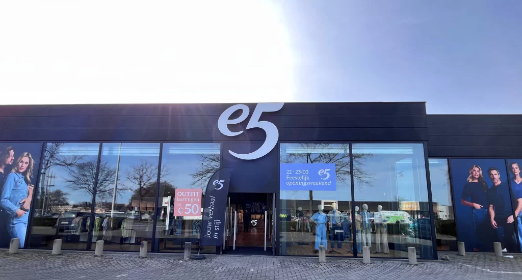 Naast stijladvies biedt de winkel ook een “Retouches & Repair”-Service, voor wie kleding wil laten inkorten, innemen of herstellen. e5 wil zo inspelen op de vraag naar maatwerk en duurzaamheid, zonder de toegankelijke prijszetting los te laten. De keten werd opgericht in 1979, maar vaart sinds de overname in 2021 door Peter en Kristof De Sutter een nieuwe koers. Vandaag telt de keten 56 winkels en 400 medewerkers.