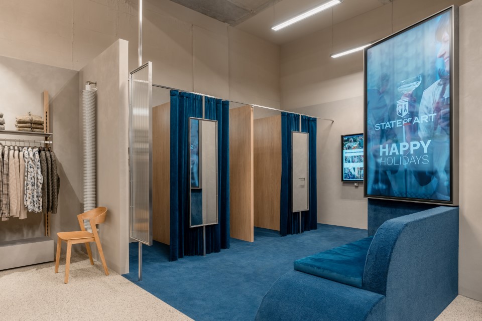 Ook technologie speelt een merkondersteunende rol in het nieuwe winkelontwerp. Digitale schermen brengen branded content in de winkel. “We willen delen wat onze ontwerpers inspireert en hoe vakmanschap in z’n werk gaat.” In de paskamers bevindt zich een interactieve kiosk waar klanten, bijgestaan door adviseurs, items die niet voorradig zijn meteen kunnen bestellen en laten leveren.