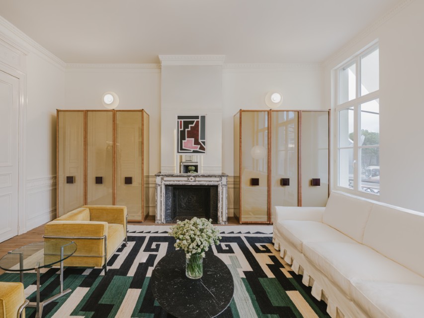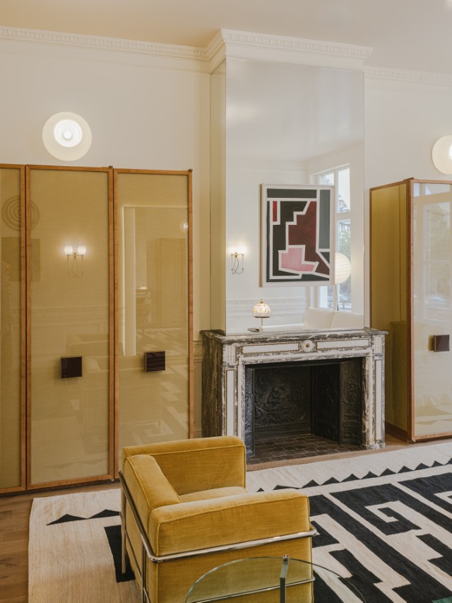 Glanzende plafonds markeren de ingang van de salon, waar twee Japanse wandlampen van glas en messing uit de jaren ‘70 een zacht diffuus licht geven. Een eclectische mix van vintage meubels, waaronder een Franse art-decofauteuil in groen fluweel, geeft de ruimte karakter.