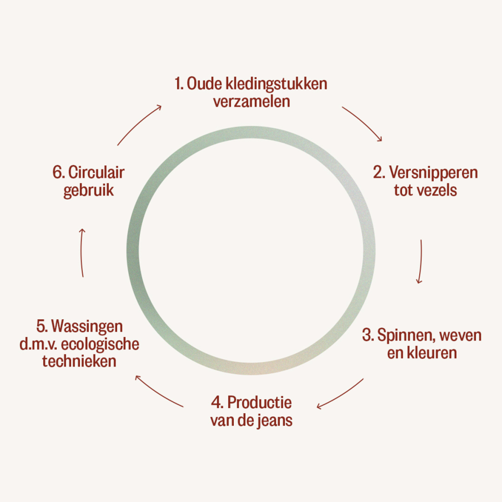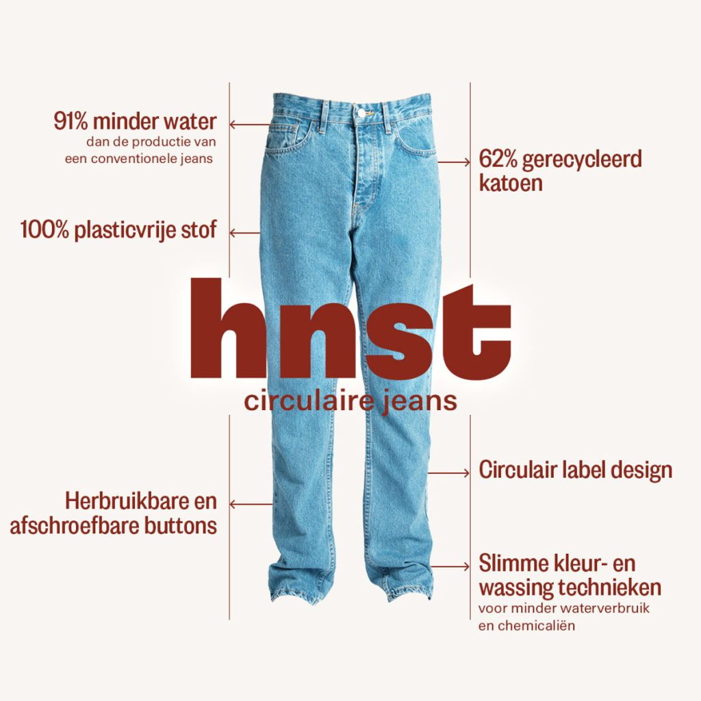 HNST jeans worden geproduceerd met aanzienlijk minder water, slechts een tiende van wat nodig is voor een conventionele jeans. Daarnaast zijn ze volledig circulair ontworpen, met afschroefbare metalen knopen en gerecycleerde denim, licht CRG Sustainability Coordinator Anaïs Claes toe. Waar een gemiddelde jeans 7,86 kg CO2-uitstoot genereert, doet een HNST jeans dat met slechts 4,16 kg.