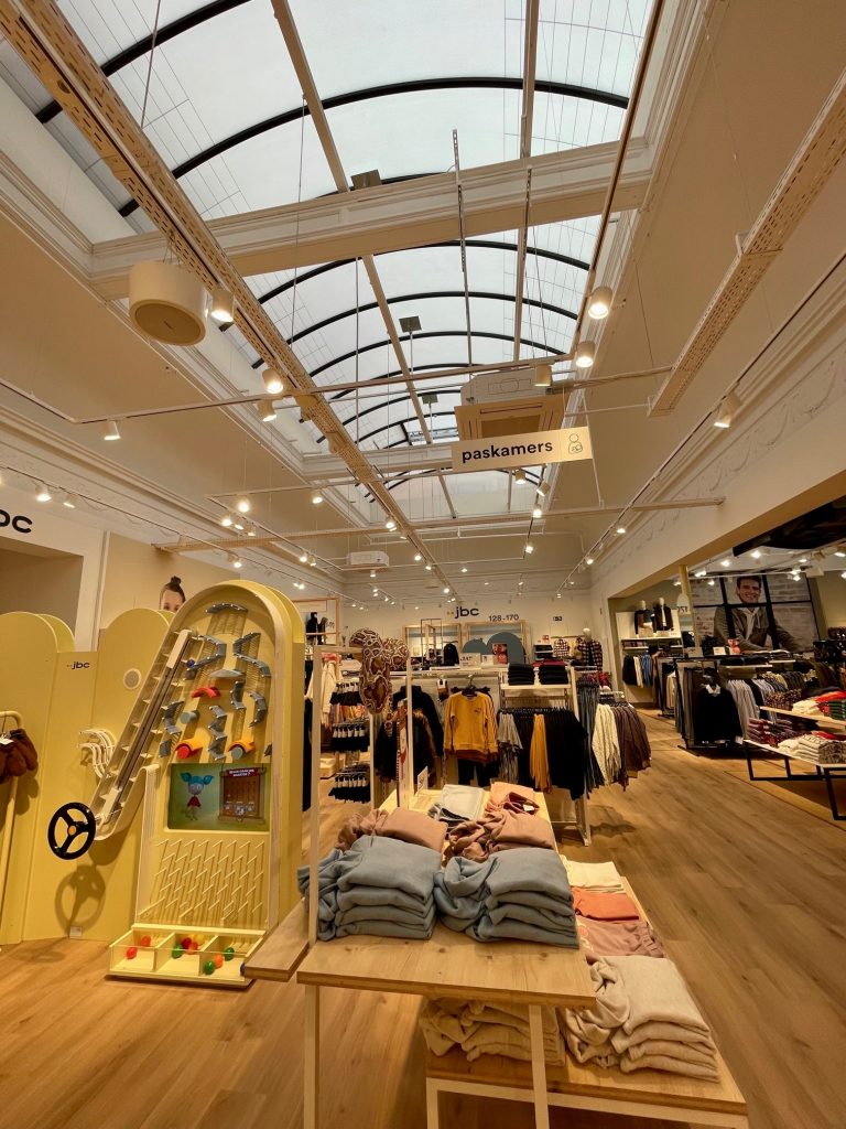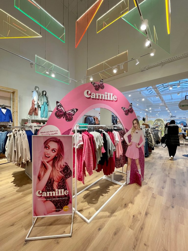 De winkel heeft ook een Studio Unique Corner, waar je babykledij ter plaatse kan laten personaliseren met een geborduurde naam. De Studio Soigneur Corner verkoopt dan weer onderhoudsproducten van de lokale merken Brauzz, Nanex en Guppy friend, die helpen om kledij langer te dragen. Een centrale plaats in de winkel is er uiteraard ook voor Camille, Vlaanderens grootste popster, waarmee JBC een samenwerking is aangegaan. “Daar zijn we heel trots op.” In de winkelinrichting koos de modeketen voor warme en duurzame materialen. Er staan stoeltjes uit gerecycleerd meubilair, tafels gemaakt uit oude paspoppen, er hangen luifels uit gerecycleerde jeans…