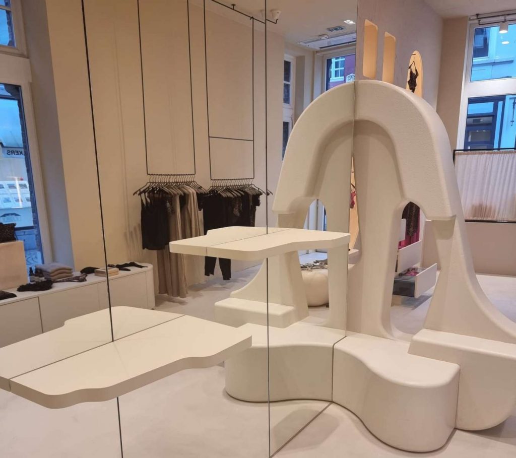 “We kozen voor een volledig nieuwe aanpak, van de presentatie tot de materialen en de routing, alles is ontworpen om vrouwen zich comfortabel te laten voelen, opgebeurd en geïnspireerd om hun perfecte persoonlijke mismatch-set te creëren”, zegt oprichtster Hoedeman. Zo is er een 3D-geprinte vrouwenbuste te vinden, samen met andere handgemaakte sculpturen. Als materialen is voor linnen gordijnen en plexiglasdetails gekozen, voor een intieme sfeer.
