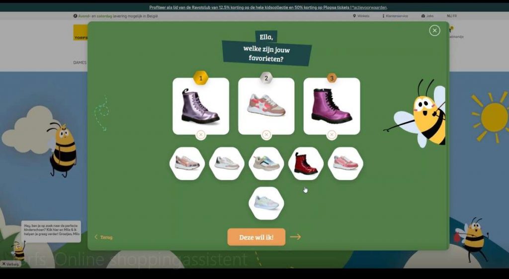 Mascottes Milo & Mila, twee bijtjes, helpen de kinderen om hun favoriete schoenen te vinden in het grote aanbod, al dan niet samen met hun (groot)ouders. Dat gebeurt eenvoudig via gebruiksvriendelijke en intuïtieve drop-down-menu’s, schuifbalken en “Duim omhoog”/”Duim omlaag”-knoppen.