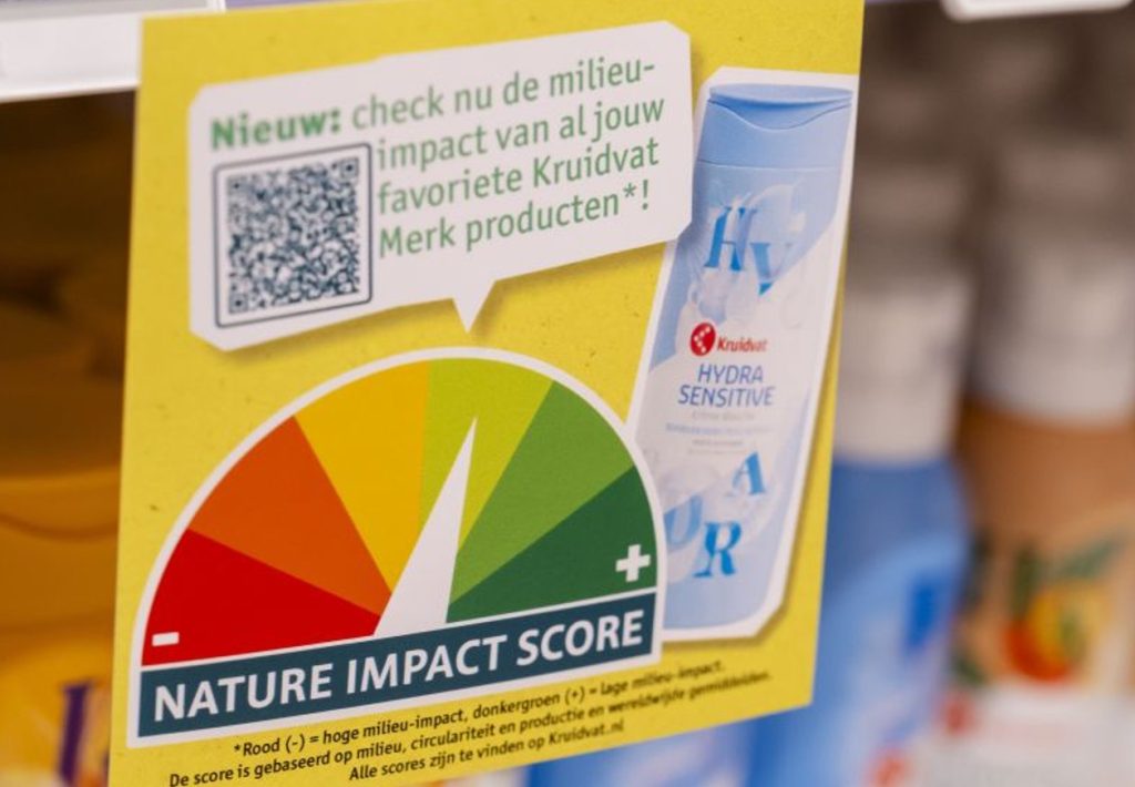 Kruidvat introduceert de Nature Impact Score, een onafhankelijke score die de milieu-impact van zijn huismerkproducten toont. Klanten zien de score in de app en op de website, maar nog niet op de verpakking.