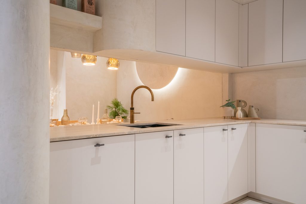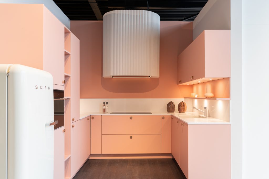 Met zijn oppervlakte van 1000 m² is de showroom in Kampenhout één van de grotere winkels van het bedrijf van de familie Van den Brande, en het is de vijfde locatie met het nieuwste belevingsconcept. De keukens staan hier niet strak naast elkaar opgesteld, wel in inspirerende omgevingen die aansluiten bij verschillende interieurstijlen. Organische, ronde vormen creëren een warme sfeer en er is een zithoek waar wachtende klanten een koffie kunnen nuttigen – of een glaasje van de huisgin.